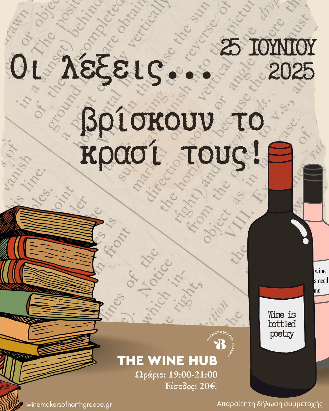 Σε αυτή τη μοναδική βραδιά, επιλέγετε ένα αγαπημένο σας απόσπασμα, ποίημα ή λογοτεχνικό κείμενο (έως 100 λέξεις) — κι εμείς επιλέγουμε 5 (συν 1 ακόμα έκπληξη) ετικέτες οίνου από τους Οινοποιούς Βορείου Ελλάδος για να τις δοκιμάσετε, συνοδεία ποικιλίας τυριών.