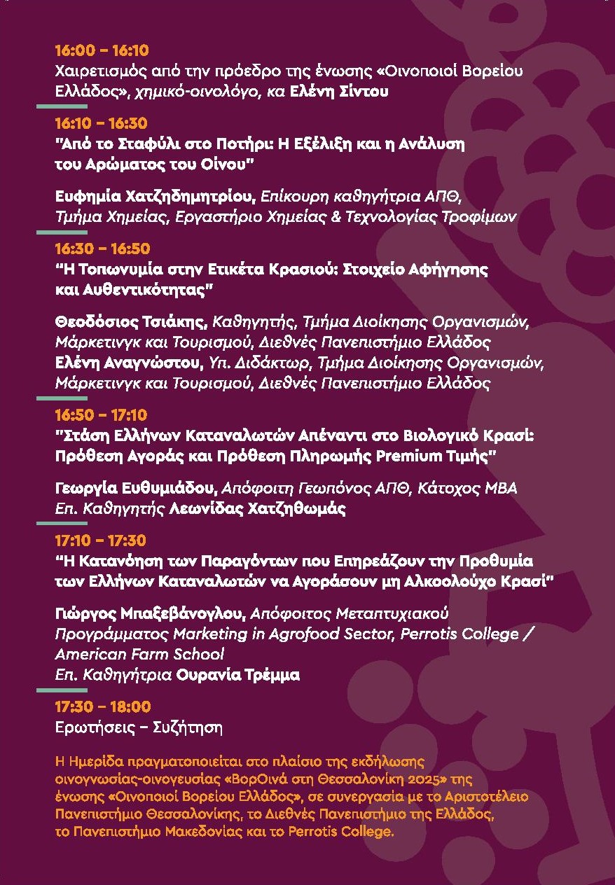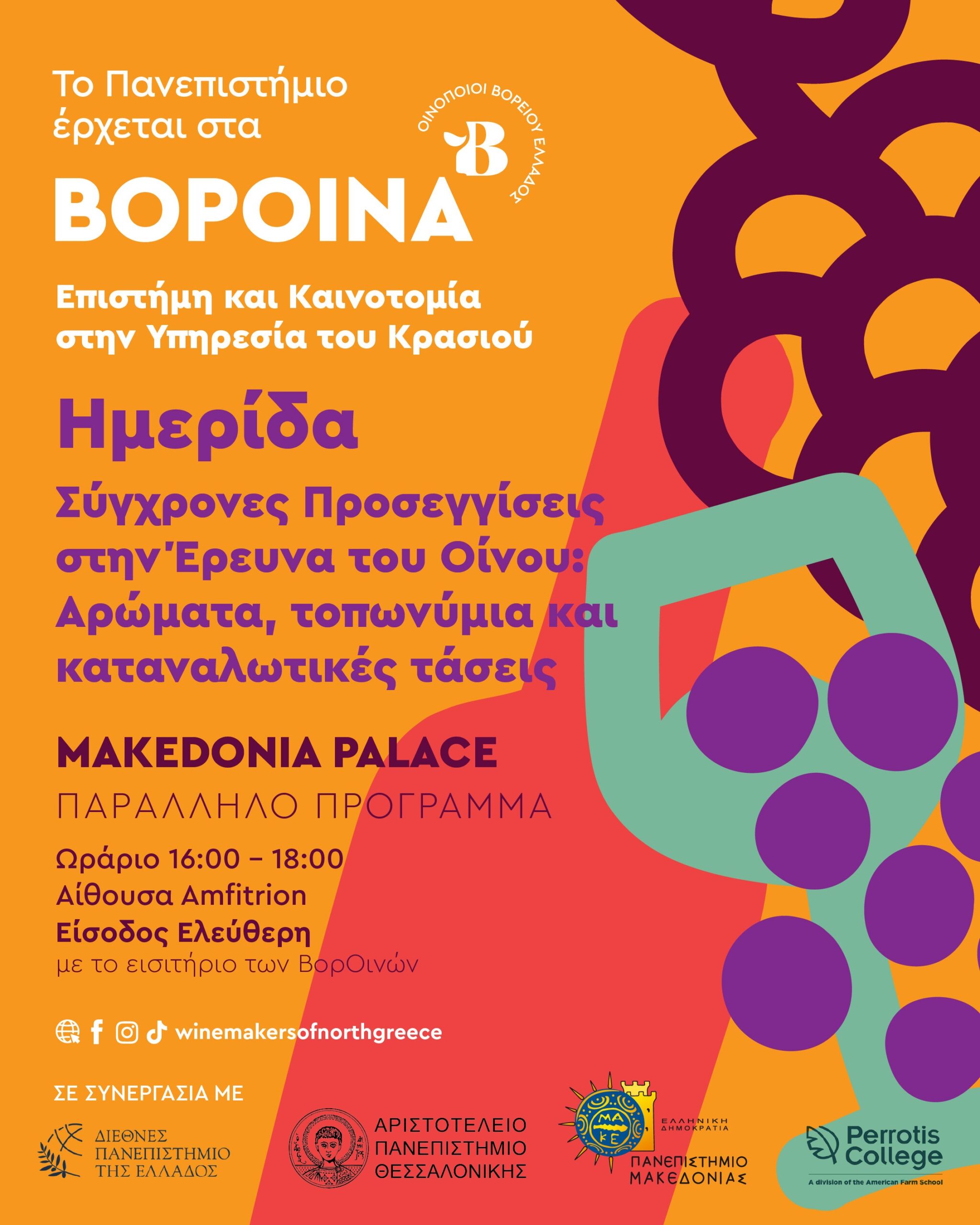 Η Ημερίδα πραγματοποιείται στο πλαίσιο της εκδήλωσης οινογνωσίας-οινογευσίας «ΒορΟινά στη Θεσσαλονίκη 2025» της ένωσης “Οινοποιoί Βορείου Ελλάδος”, με τη συνεργασία του Αριστοτελείου Πανεπιστημίου Θεσσαλονίκης, του Διεθνούς Πανεπιστημίου της Ελλάδας, του Πανεπιστημίου Μακεδονίας και του Perrotis College.