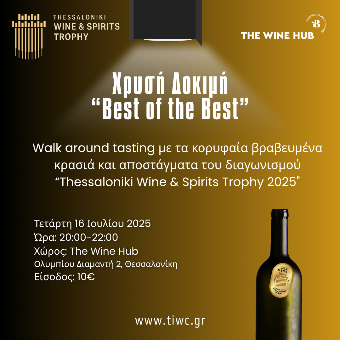 Την Τετάρτη 16 Ιουλίου 2025, ο χώρος γευστικών δοκιμών του «The Wine Hub» στη Θεσσαλονίκη, σας υποδέχεται στη «Χρυσή Δοκιμή», μια ξεχωριστή οινογευσία αφιερωμένη στα βραβευμένα κρασιά και αποστάγματα του κορυφαίου διαγωνισμού «Thessaloniki Wine & Spirits Trophy 2025».